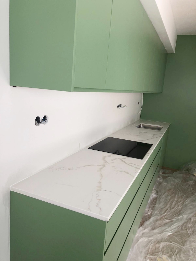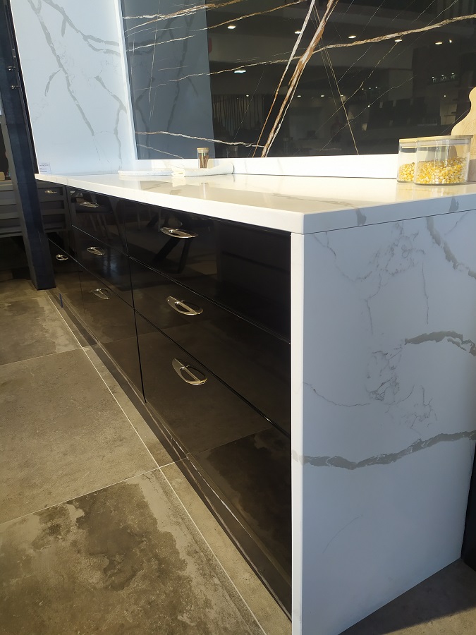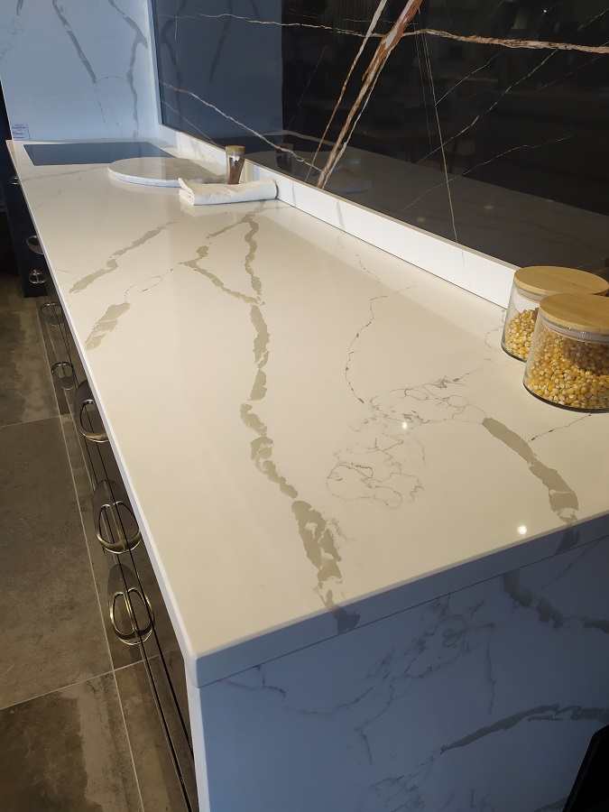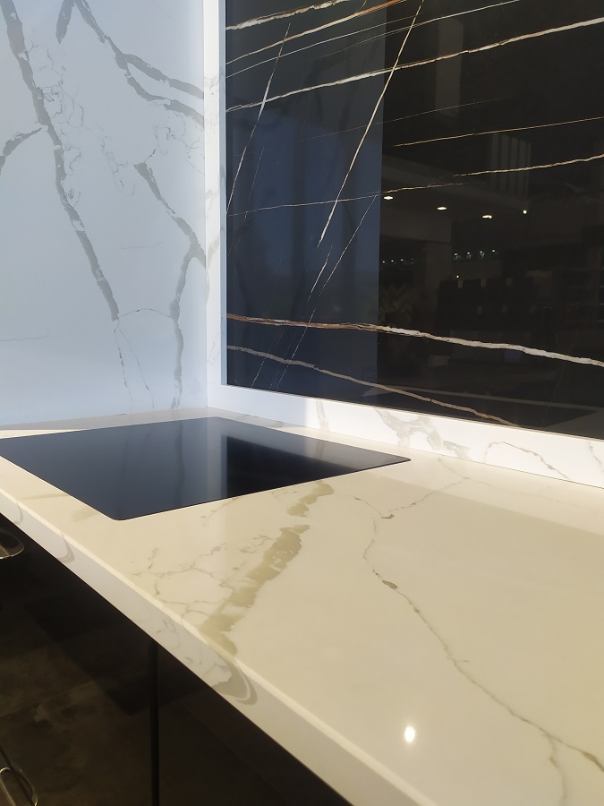 Ostvarite najtraženiji izgled, svima dobro poznati kamen Carrara i trend koji vlada u svijetu građevine. U obliku quartza idealan je za radnu ploču u kuhinji. sintetiÄki kamen kvarc je zbog velikog sadržaja prirodnog kvarca u svom sastavu (95%) izuzetno otporan na ogrebotine, te se stoga preporučuje kao dugotrajno rješenje za radnu ploču u kuhinji, šanku, ploču ispod umivaonika u kupaonici, kao ploča za stol u blagovaonici ili dnevnom boravku. Polimerne smole koje povezuju quartzne kristale daju ovom materijalu određenu razinu elastičnosti, što u kombinaciji sa tvrdoćom quartza pridonosi otpornosti na različite udarce do kojih može doći u svakodnevnoj uporabi. Nije porozan i zbog toga ne upija različite tekućine s kojima može doći u kontakt u kuhinji kao što su kava, čaj, ocat, ulje, mlijeko, vino, gazirana pića itd. Materijal je otporan i na vrlo visoke temperature (do 150°C). Važno je znati Ne postoji materijal koji je u potpunosti otporan na ogrebotine i upijanje pa se kod quartza kao i kod svih ostalih materijala preporučuje pažljivo rukovanje. Iako je otporan na visoke temperature nije poželjno nanošenje vrućih predmeta direktno na njegovu površinu, nego je potrebno podmetnuti nešto ispod vrućeg predmeta pa onda položiti na quartz.