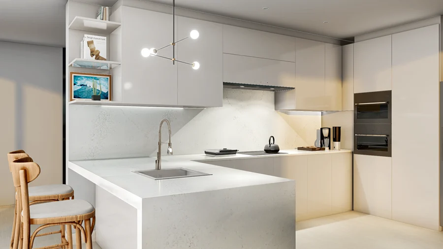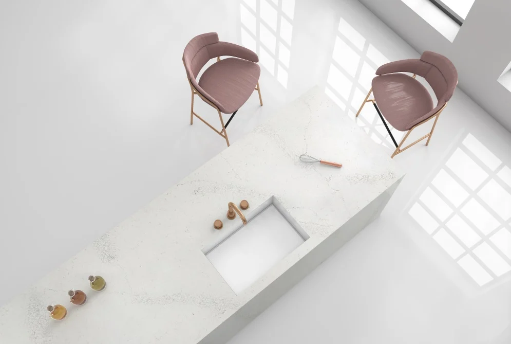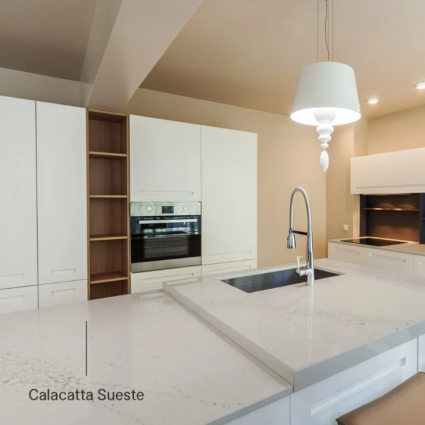 Кварцевый камень Calacatta Sueste доступен толщиной 2 см. Благодаря высокому содержанию натурального кварца в своем составе (95%), синтетический кварцевый камень чрезвычайно устойчив к царапинам и поэтому рекомендуется в качестве долговечного решения для кухонных столешниц, барных стоек, столешниц под раковинами в ванной, а также в качестве столешниц в столовой или гостиной. Полимерные смолы, связывающие кристаллы кварца, придают этому материалу определенную эластичность, которая в сочетании с твердостью кварца способствует устойчивости к различным ударам, которые могут возникнуть при повседневном использовании. Он не пористый и, следовательно, не впитывает различные жидкости, с которыми может контактировать на кухне, такие как кофе, чай, уксус, масло, молоко, вино, газированные напитки и т. д. Материал также устойчив к очень высоким температурам (до 150 °C). Важно знать: не существует материала, полностью устойчивого к царапинам и впитыванию, поэтому с кварцем, как и со всеми другими материалами, рекомендуется обращаться осторожно. Несмотря на то, что он устойчив к высоким температурам, не рекомендуется прикладывать горячие предметы непосредственно к его поверхности, а необходимо подложить что-нибудь под горячий предмет, а затем положить его на кварц.