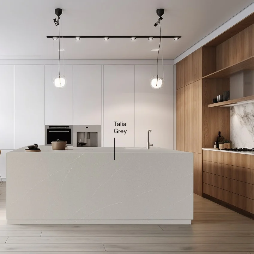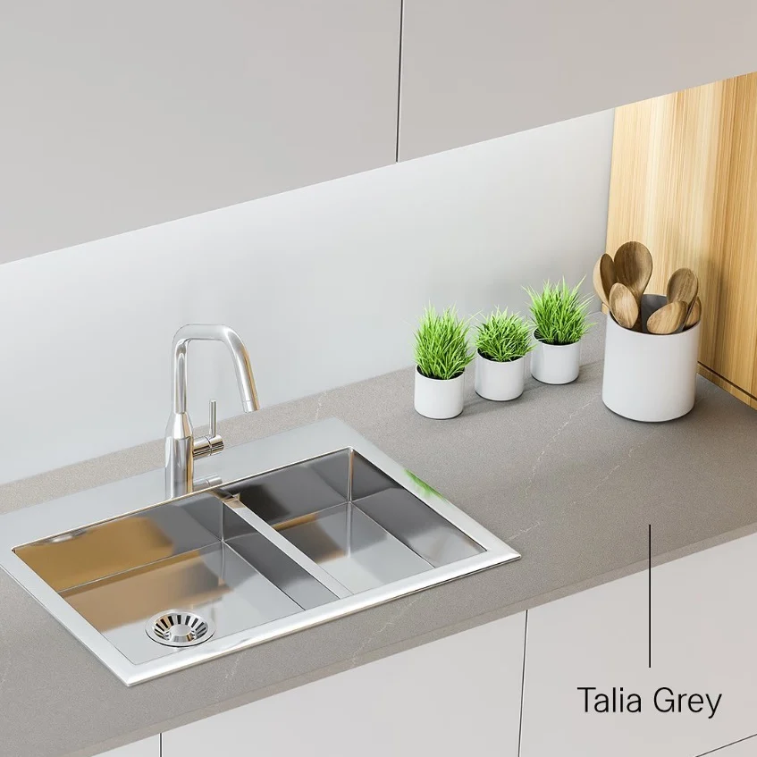 Кварцевый камень Talia Grey доступен толщиной 2 см. Благодаря высокому содержанию натурального кварца в своем составе (95%), синтетический кварцевый камень чрезвычайно устойчив к царапинам и поэтому рекомендуется в качестве долговечного решения для кухонных столешниц, барных стоек, столешниц под раковинами в ванной, а также в качестве столешниц в столовой или гостиной. Полимерные смолы, связывающие кристаллы кварца, придают этому материалу определенную эластичность, которая в сочетании с твердостью кварца способствует устойчивости к различным ударам, которые могут возникнуть при повседневном использовании. Он не пористый и, следовательно, не впитывает различные жидкости, с которыми может контактировать на кухне, такие как кофе, чай, уксус, масло, молоко, вино, газированные напитки и т. д. Материал также устойчив к очень высоким температурам (до 150 °C). Важно знать: не существует материала, полностью устойчивого к царапинам и впитыванию, поэтому с кварцем, как и со всеми другими материалами, рекомендуется обращаться осторожно. Несмотря на то, что он устойчив к высоким температурам, не рекомендуется прикладывать горячие предметы непосредственно к его поверхности, а необходимо подложить что-нибудь под горячий предмет, а затем положить его на кварц.